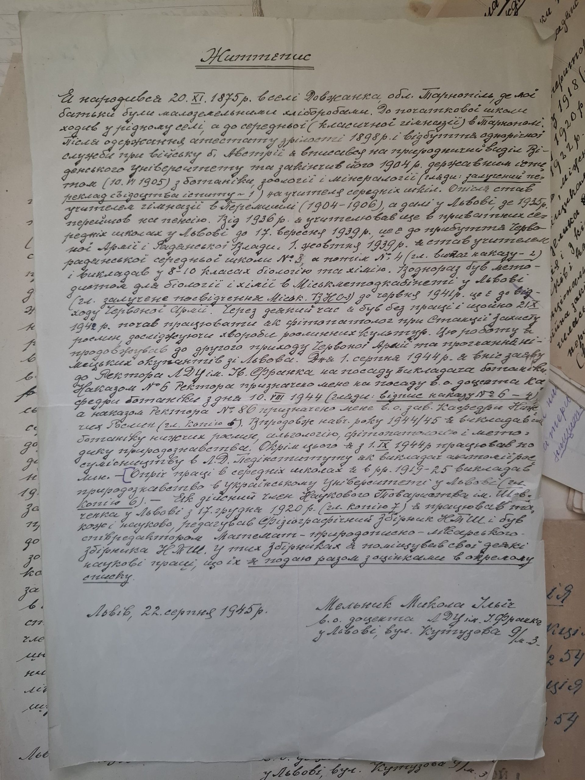 В Архіві Львівського університету організовано особовий архівний фонд ботаніка, природознавця Миколи Мельника (1875–1955). На архівне опрацювання матеріали до Університету передала професорка кафедри української мови імені професора Івана Ковалика Зоряна Купчинська.